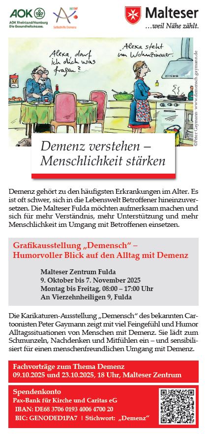 Wir freuen uns Ihnen mitteilen zu können, dass auch in diesem Jahr ein Infotag Demenz stattfinden wird. Erstmalig wird der Infotag im Foyer des Herz-Jesu-Krankenhaus Fulda veranstaltet. Am Freitag, den 14.11.2025 erhalten Sie im Zeitraum von 14-18…