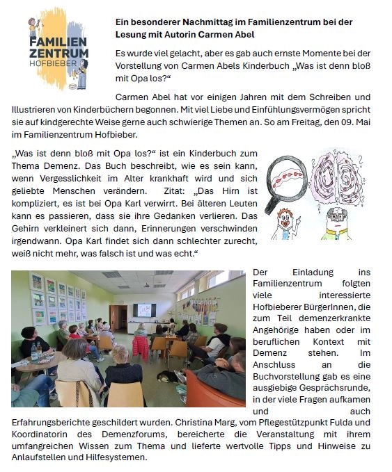 Die Kinderbuchautorin Carmen Abel veranstaltete am Freitag den 09.05.2025 ihre erste Lesung im Familienzentrum Hofbieber. In ihrem Buch "Was ist denn bloß mit Opa los?" beschreibt sie kindgerecht das ernste und schwierige Thema Demenz. Frau Abel ist staatlich anerkannte Erzieherin und möchte mit ihrem Buch eine Basis schaffen, um mit Kindern über Demenz ins Gespräch zu kommen. Dies ist ihr hervorragend und eindrucksvoll gelungen. Sie bekam dafür ein großes Lob von Christina Marg, der Koordinatorin des Demenzforums Fulda. Diese betonte nochmals die Wichtigkeit im sozialen System "Familie" offen über die Erkrankung zu sprechen und gemeinsam Wege und Lösungen zu suchen. Zu diesem System gehören auch die Kinder, die mit ihren feinen Antennen durchaus erkennen, das sich und was sich verändert. Anders als Erwachsene können Kinder die Veränderungen nicht zuordnen. Über die Diagnose Demenz mit Ihnen zu sprechen und sie aufzuklären, schafft Sicherheit und die Möglichkeit mit den Gefühlen umzugehen. Anbei finden Sie die Berichterstattung zu diesem einzigartigen Ereignis.